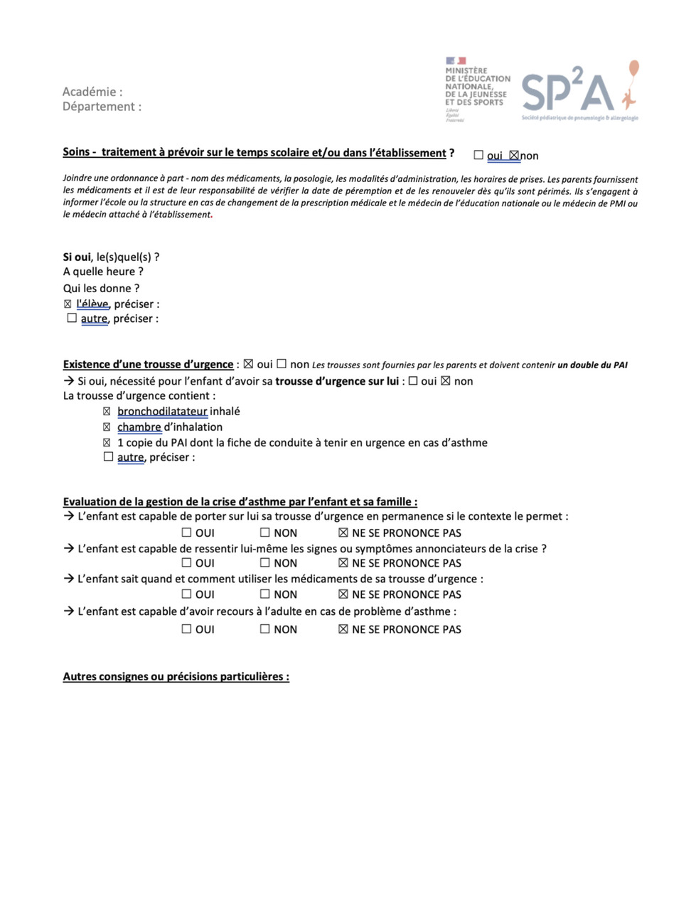 - l’ordonnance (document nécessaire à l’administration des médicaments et valable un an au plus) précisant les besoins thérapeutiques de l’enfant et signée par le médecin qui le suit pour sa pathologie. Les traitements de fond de l’asthme, pris à domicile (habituellement le matin et le soir), restent sous la seule responsabilité des parents, et ne peuvent pas être inclus dans le PAI ;