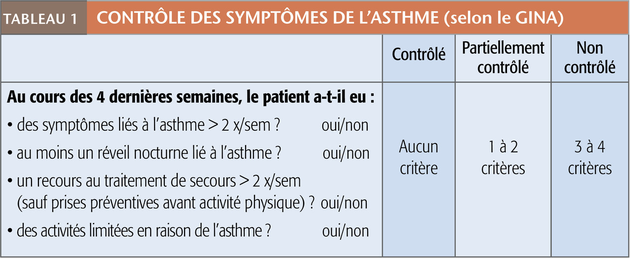 – l’absence de symptômes diurnes et nocturnes, de limitation de l’activité physique, de recours aux BDCA (sauf en préventif) et aux soins urgents pour asthme ;