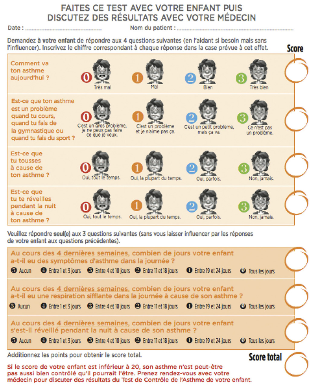 La notion de contrôle tend à remplacer celle de sévérité, afin d’appréhender de façon plus dynamique l’activité de l’asthme sur une période récente. Le degré de contrôle varie selon les exacerbations et les symptômes intercritiques. Des questionnaires validés peuvent être remplis par l’enfant et ses parents avant la consultation : C-ACT (Childhood Asthma Control Test ; fig. 1) ou celui proposé par le GINA (tableau 1). Outre le contrôle clinique, l’évaluation intègre les résultats des EFR.