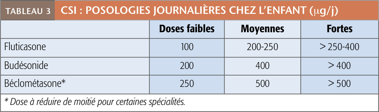 En 1re intention, un CSI à dose faible à moyenne (tableau 3) est proposé, pendant au moins 3 mois (la prescription de posologies plus fortes, y compris en nébulisation, nécessite un avis spécialisé). Aux doses usuelles, peu d’effets indésirables :