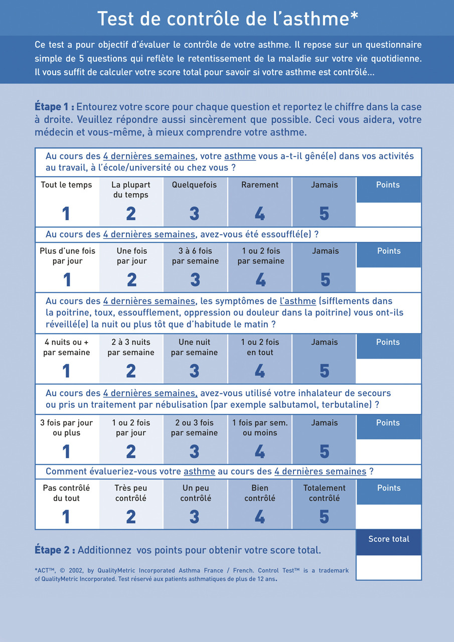 La notion de bon contrôle de la maladie asthmatique est fondamentale, elle repose sur la vérification, à chaque consultation médicale, du degré de maîtrise des symptômes cliniques. Ainsi, quatre questions portant sur la situation du mois écoulé, doivent toujours être posées :