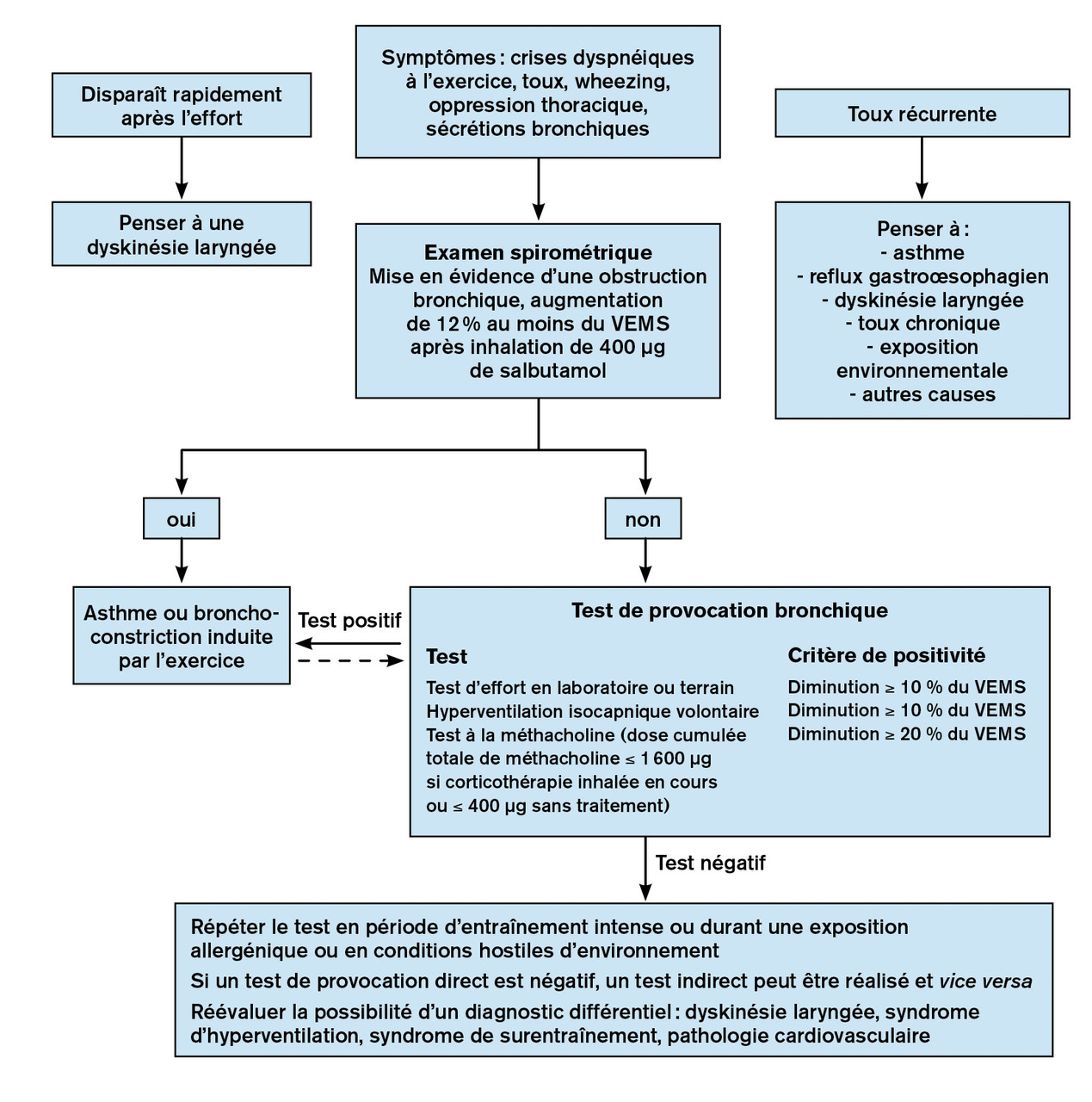 Un algorithme diagnostique de l’asthme à l’effort et de la bronchoconstriction induite par l’exercice a été proposé en 2015 (