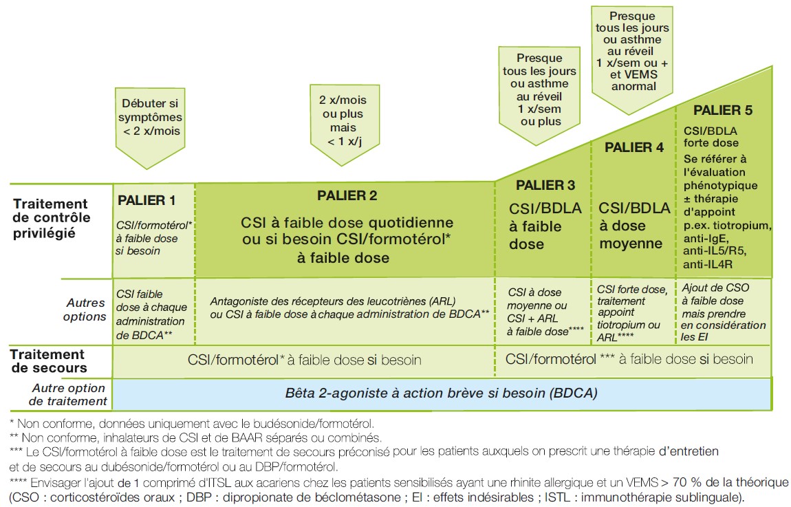 Actuellement, il est proposé que tous les asthmatiques symptomatiques aient un traitement anti-inflammatoire par corticostéroïde inhalé (CSI), dès le diagnostic, quelle que soit leur sévérité. Trois stratégies sont possibles (