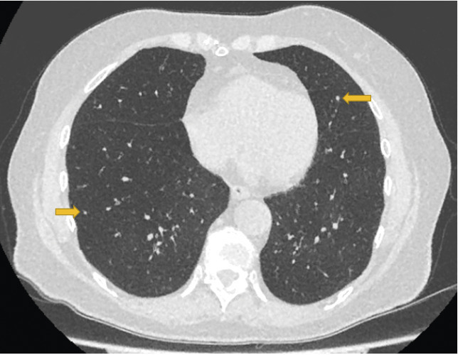 Christiane, 75 ans, consulte pour une toux invalidante, associée à une dyspnée d’effort et des sifflements. Un diagnostic d’asthme tardif a été fait à l’âge de 47 ans, traité par fluticasone à forte dose (1 000 µg/j), salmétérol et montélukast. Malgré le traitement, la toux persiste et la dyspnée s’aggrave progressivement, entraînant une limitation importante dans sa vie quotidienne. Les épreuves fonctionnelles respiratoires objectivent un trouble ventilatoire obstructif non réversible sévère (VEMS 780 ml, soit 36 %, VEMS/CV 40 %) avec une distension thoracique (volume résiduel 198 %). Le scanner thoracique (figure ) révèle des micronodules diffus (flèches jaunes ) et un aspect en mosaïque évoquant une bronchiolite. Après biopsie pulmonaire chirurgicale, l’examen anatomopathologique pose le diagnostic d’hyperplasie neuroendocrine pulmonaire diffuse idiopathique (DIPNECH).