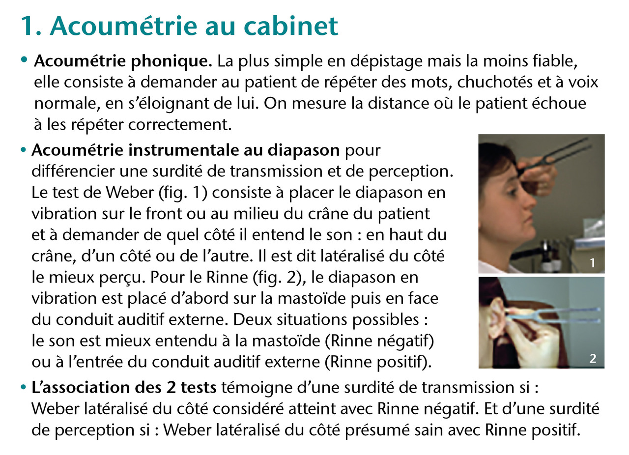Le médecin traitant vérifie l’état des oreilles par l’examen otoscopique et fait passer des tests simples : acoumétrie (encadré 1), questionnaire de dépistage des troubles sensoriels et cognitifs (encadré 2).
