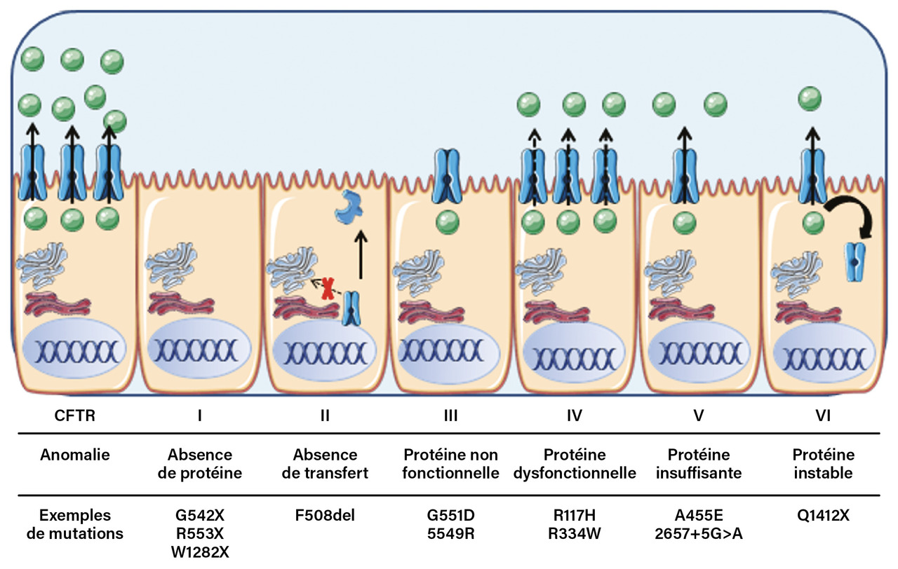 Plus de 2 000 variants du gène CFTR sont connus. Ces mutations sont classées en six catégories (