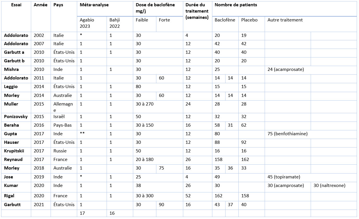 Les essais évaluant l’efficacité du baclofène dans le traitement de la dépendance à l’alcool ont fait l’objet de nombreuses méta-analyses. Les deux plus récentes prennent en compte le plus grand nombre d’essais. La première10 est une méta-analyse en réseau qui étudie les essais comparant divers traitements, dont le baclofène, soit entre eux soit à un placebo ; la seconde, de la collaboration Cochrane,11 n’étudie que les essais avec le baclofène.