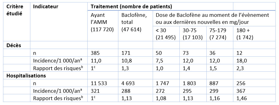 Dans l’étude de la sécurité du baclofène, les risques d’hospitalisation et de décès, ajustés seulement en fonction du sexe et de l’âge, sont un peu plus faibles chez les utilisateurs de baclofène que chez les utilisateurs d’autres médicaments. C’est seulement lorsque on évalue le risque en fonction de la dose de baclofène comme variable dépendant du temps, en utilisant un modèle ajusté sur le sexe, l’âge, et six autres caractéristiques mesurées au début du traitement, qu’on observe une augmentation des risques en fonction de la dose (tableau 2).