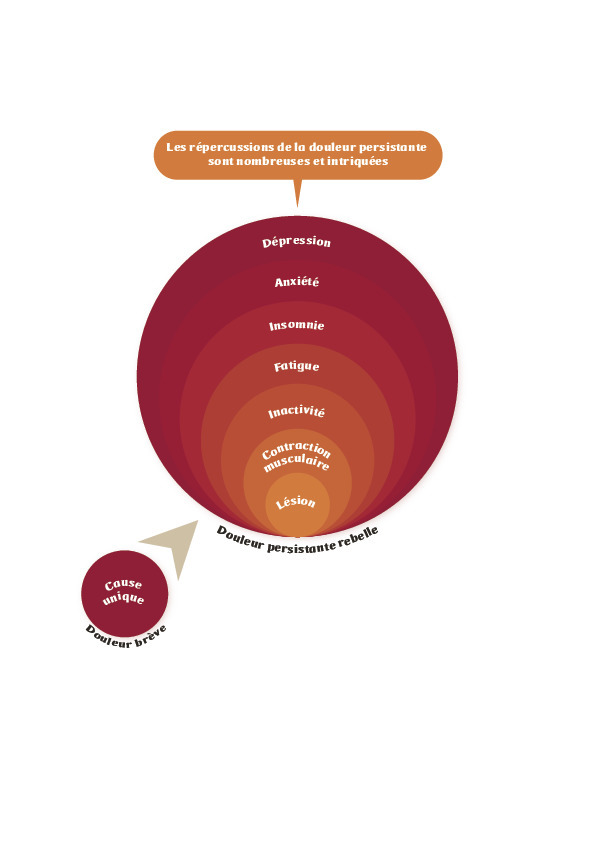 Cette évolution s’explique par des modifications structurelles du système nerveux central induites par une stimulation douloureuse prolongée (mémoire de la douleur). La douleur n’est plus contrôlée et d’ailleurs plus contrôlable par les seuls médicaments et elle envahit progressivement tout l’univers psychologique, affectif, cognitif et social du patient (c’est la maladie douloureuse chronique).
