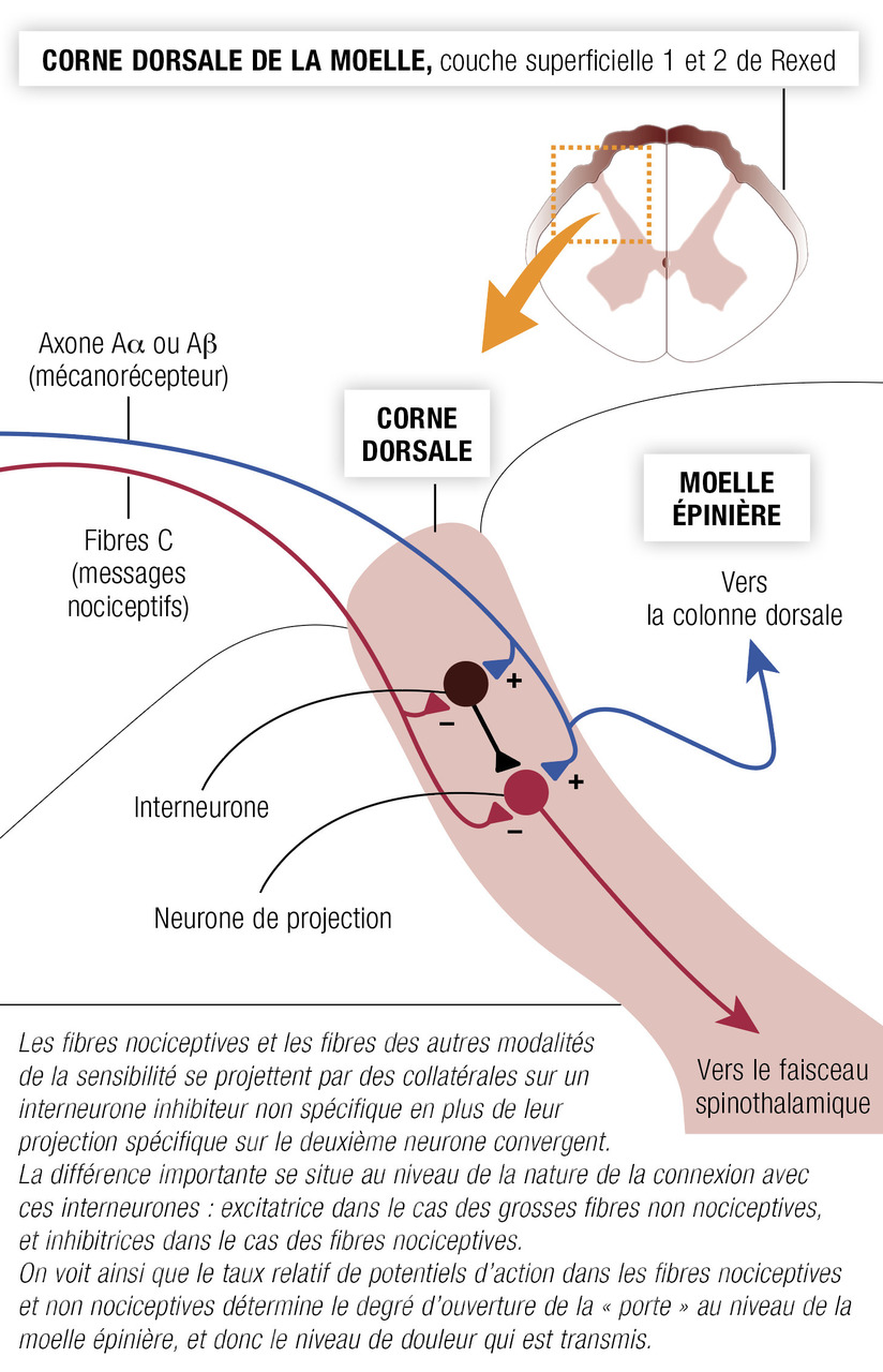 - le premier palier de ce contrôle est médullaire (fig. 3) et repose sur la théorie du gate control de Wall et Melzack (1965). Il s’agit du contrôle segmentaire de la douleur, présent à chaque étage dans la corne dorsale médullaire ;