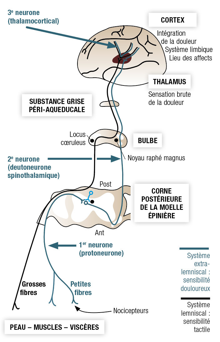La douleur est une information sensorielle ascendante véhiculée de la périphérie de l’organisme (terminaisons sensitives libres, cutanées ou viscérales) jusqu’aux centres d’intégration cérébraux. Son organisation anatomique respecte donc l’organisation générale du système somato-sensoriel en 3 niveaux (fig. 1) avec :