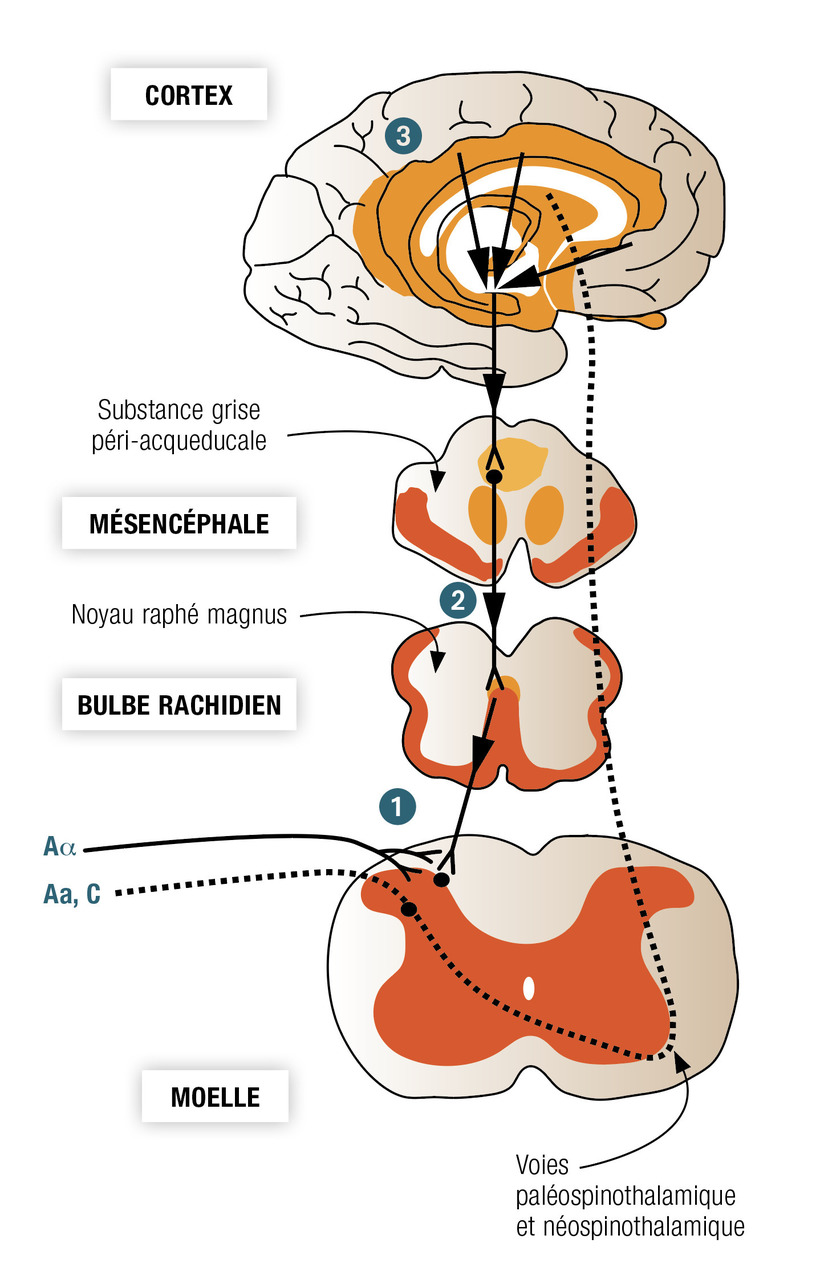 - le troisième palier est le contrôle descendant d’origine corticale. L’hypnose ou l’effet placebo montre que la réponse corticale à l’intégration du phénomène douloureux peut diminuer la perception douloureuse. L’étude en imagerie fonctionnelle montre que les régions du cortex préfontral dorsolatéral et du cortex cingulaire antérieur peuvent activer la substance grise périaqueducale et recruter le contrôle inhibiteur diffus induit par les stimulations nociceptives en réponse à une douleur.