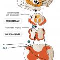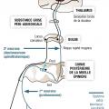 - un troisième neurone thalamocortical, qui s’articule avec le précédent à partir du thalamus (noyau ventro-postéro-latéral pour le corps hors région cervicale, noyau ventro-postéro- médian pour la région cervicale et céphalique). Ces noyaux du thalamus sont des relais où convergent l’ensemble des voies somesthésiques de l’organisme. À cet endroit s’effectue une intégration de l’information nociceptive avant sa projection par le troisième neurone sur les aires corticales somatosensorielles (circonvolution pariétale ascendante), rendant ainsi possible la localisation corporelle précise du stimulus d’origine. D’autres projections se font sur d’autres aires cérébrales (cortex préfrontal, cortex cingulaire antérieur, système limbique...) et expliquent ainsi la mémorisation ou le retentissement émotionnel du phénomène douloureux (v. Focus).