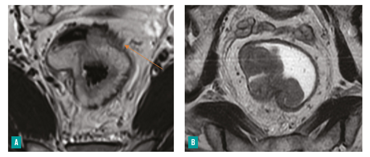 Le protocole est adapté à la localisation de la tumeur et comprend au minimum : des coupes en pondération T2 sans saturation de la graisse dans les trois plans de l’espace (le plan coronal et le plan axial étant respectivement parallèle et perpendiculaire à l’axe de la tumeur, avec une épaisseur maximale de coupe de 3 mm) et des coupes axiales en pondération-diffusion (valeur minimale du gradient de diffusion b : 800) avec cartographie ADC (apparent diffusion coefficient). Des coupes coronales parallèles au plan du canal anal en pondération T2 doivent également être réalisées en cas de tumeur distale pour évaluer ses rapports avec l’appareil sphinctérien. Selon les centres, un lavement pré-IRM, une opacification préalable de l’ampoule rectale par du gel et l’administration d’antispasmodiques peuvent être utilisés, mais ces derniers n’ont pas fait l’objet d’un consensus lors des dernières recommandations.3