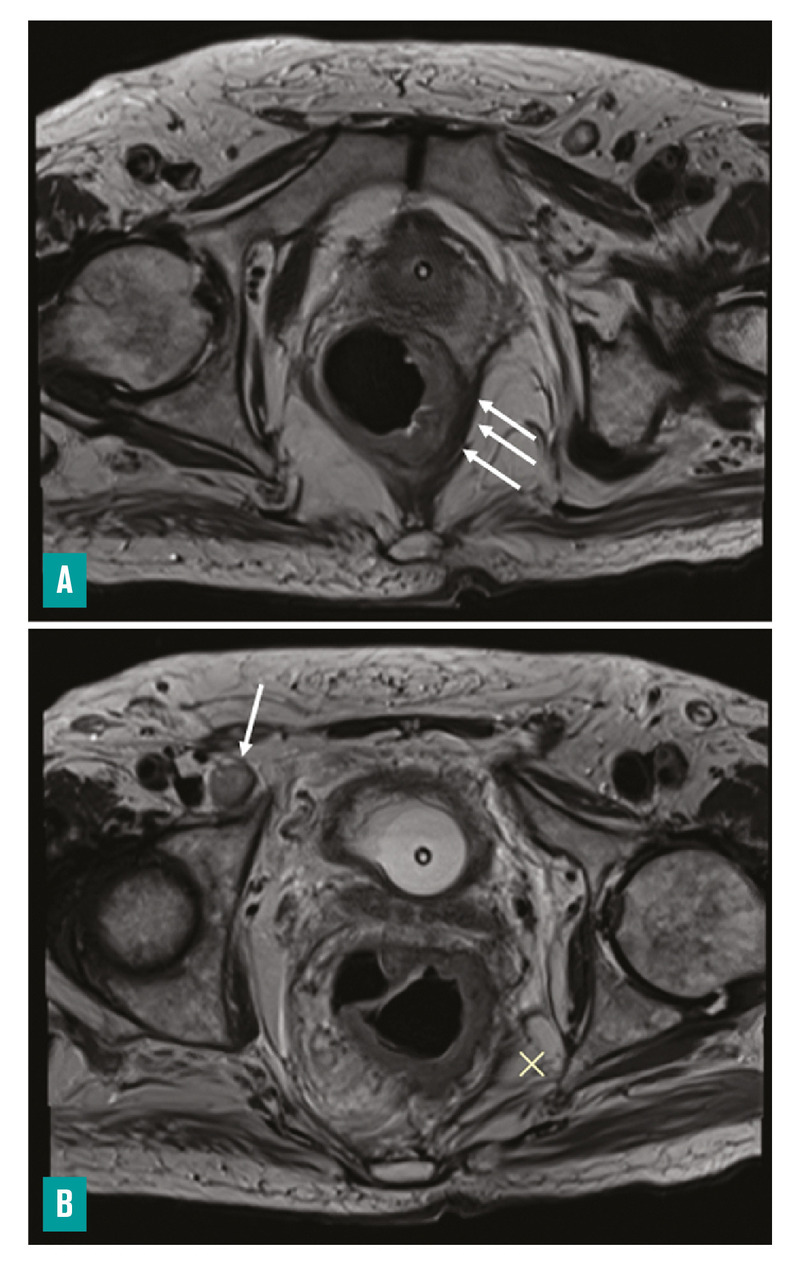– Concernant le stade T, le stade T3 peut être divisé en quatre sous-stades en fonction de l’extension au sein du mésorectum : T3a, inférieure à 1 mm ; T3b, de 1 à 5 mm ; T3c, de 5 à 15 mm ; T3d supérieure à 15 mm. Cette distinction intervient dans le choix du traitement selon les dernières recommandations européennes.2