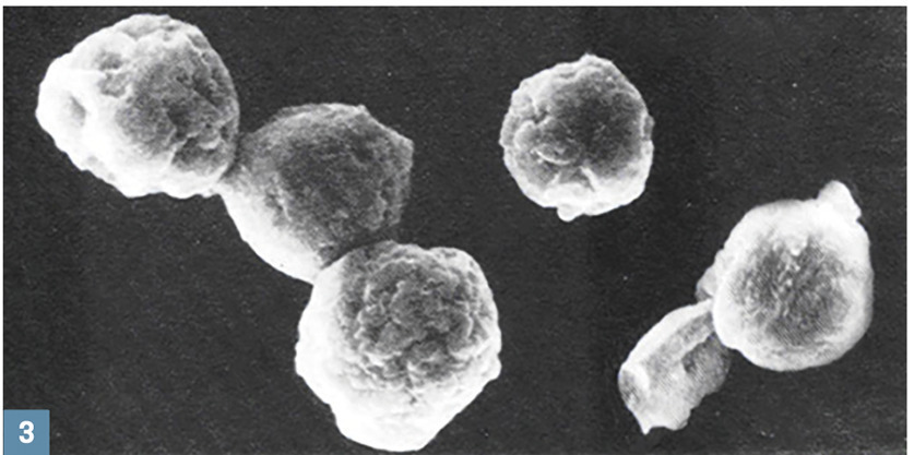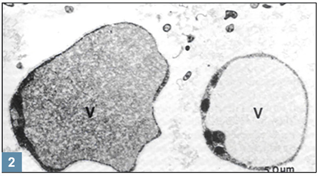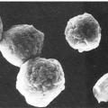 Ils ont la forme d’une sphère avec une grande vacuole qui repousse le cytoplasme en périphérie, aspect confirmé par la microscopie électronique : grande vacuole vide et cytoplasme périphérique contenant noyaux, mitochondries, appareil de Golgi, ribosomes et inclusions lipidiques (fig. 2 ). En microscope électronique à balayage : sphères à la surface rugueuse (fig. 3 ).