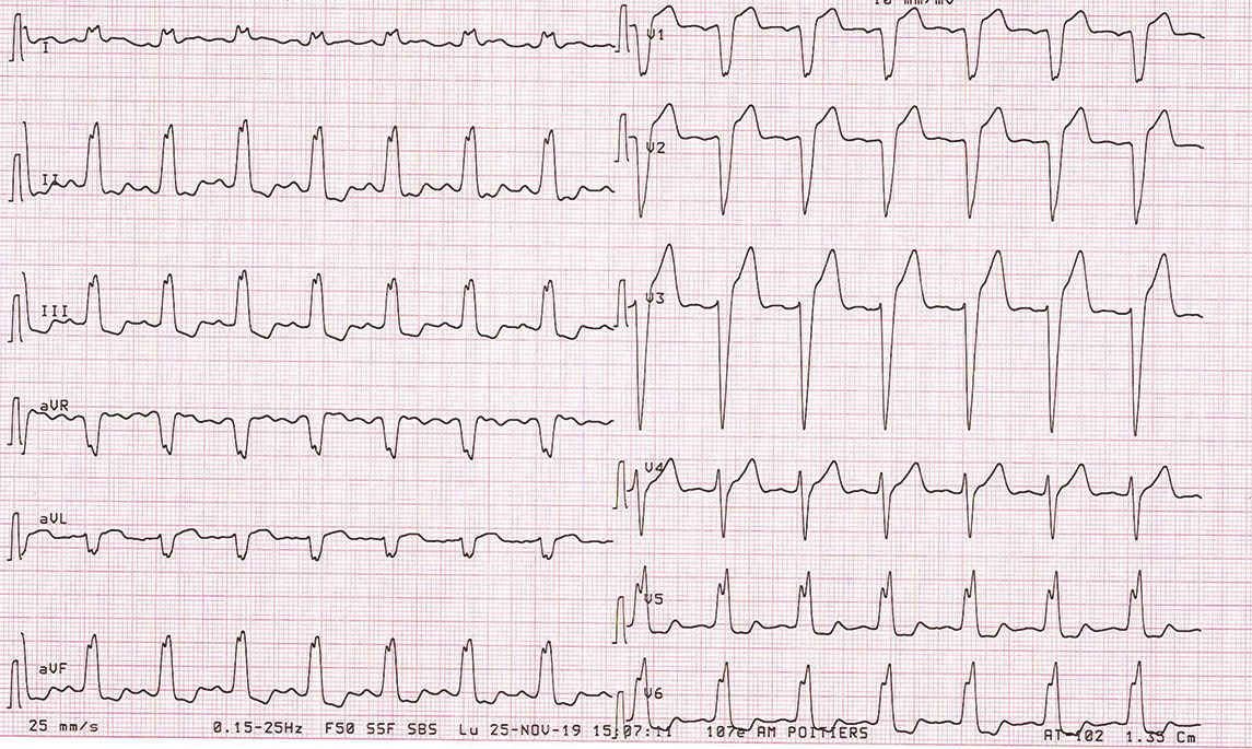 La prévalence du bloc de branche gauche dans la population générale est faible (< 1 %),1 son développement passant le plus souvent inaperçu. Il est devenu une entité cardiaque à part entière et sa découverte nécessite donc systématiquement des explorations. Il ne s’agit en aucun cas d’une variante de la normale. Les critères diagnostiques associent une durée de QRS > 120 ms et un retard gauche en V5-V6 et DI-VL.2 En fonction du contexte, certaines causes sont à rechercher en urgence : ischémie, hyperkaliémie et intoxication médicamenteuse. Sans élément en faveur d’une urgence thérapeutique, le patient doit rapidement bénéficier d’une consultation cardiologique à la recherche d’une cardiopathie sous-jacente.