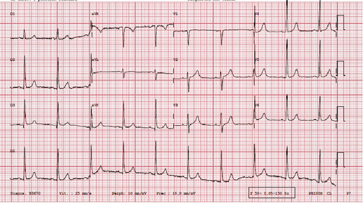 Cet homme de 58 ans, sans antécédent, se présentait à sa visite médicale professionnelle. Sur l’électrocardiogramme on notait un bloc de branche gauche complet (fig. 1 ), inconnu jusqu’alors. Le patient était adressé en consultation de cardiologique avec un bilan sanguin en amont de la consultation montrant une anémie macrocytaire à 10 g/dL arégénérative et une thrombopénie à 149 G/L. Le bilan cardiologique révélait une cardiomyopathie dilatée. Après plusieurs mois d’exploration hématologique, et le recours à de multiples transfusions, le diagnostic d’érythroblastopénie auto-immune était posé. Le patient était traité par ciclosporine avec une efficacité immédiate permettant la normalisation de l’hémogramme et de l’électrocardiogramme (fig. 2 ).