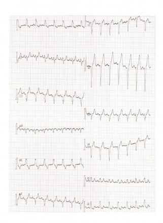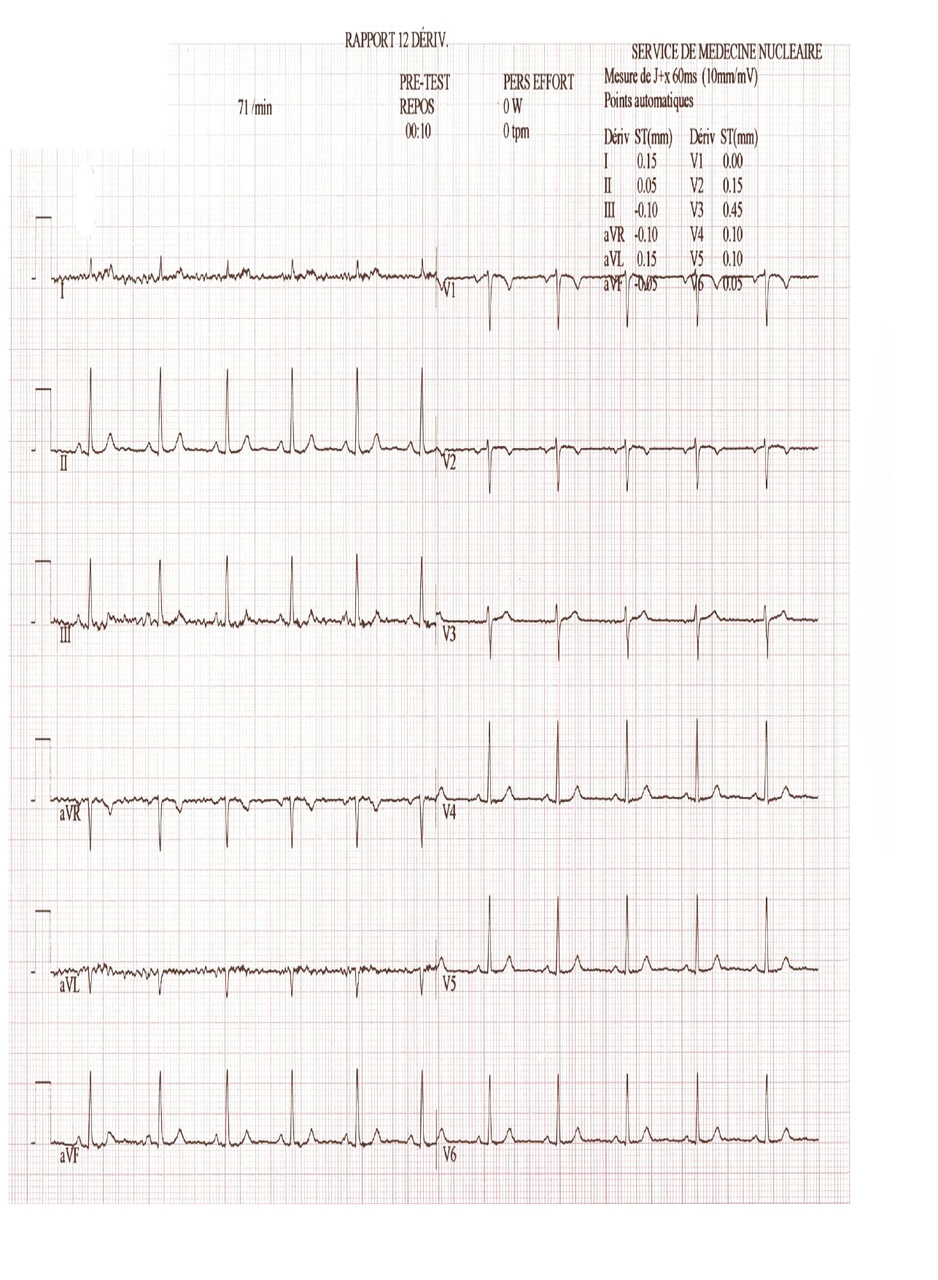 Mme M, 53 ans, secrétaire au cabinet médical avec une hypothyroïdie substituée, avait ressenti soudainement une douleur thoracique avec angoisse et palpitations. L’électrocardiogramme (ECG) initial était rassurant (fig. 1 ) et les symptômes disparaissaient pour réapparaître 15 minutes plus tard. Un nouvel ECG (fig. 2 ) montrait un bloc de branche gauche complet. Transportée aux urgences, le premier bilan ne notait ni élévation des troponines ni autre anomalie biologique. L’ECG revenu à la normale, elle était hospitalisée pour un bilan approfondi : la coronarographie et la scintigraphie myocardique ne montraient pas d’ischémie ; l’épreuve d’effort notait à nouveau un bloc de branche gauche. Devant ce bloc intermittent chronodépendant, un traitement par bêtabloquant était prescrit.