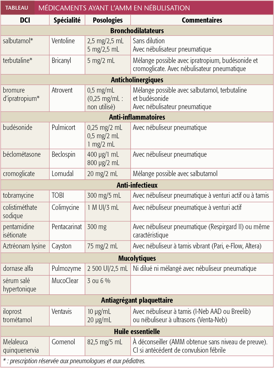 Le couple nébuliseur-médicament est à respecter impérativement. Tout changement de compresseur, de gaz vecteur ou de dilution modifie la qualité de l’aérosol, avec risque de mésusage, mal toléré. Le plus souvent, les médicaments ayant l’AMM pour la nébulisation sont prêts à l’emploi et ne nécessitent pas de dilution (tableau).