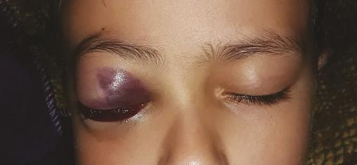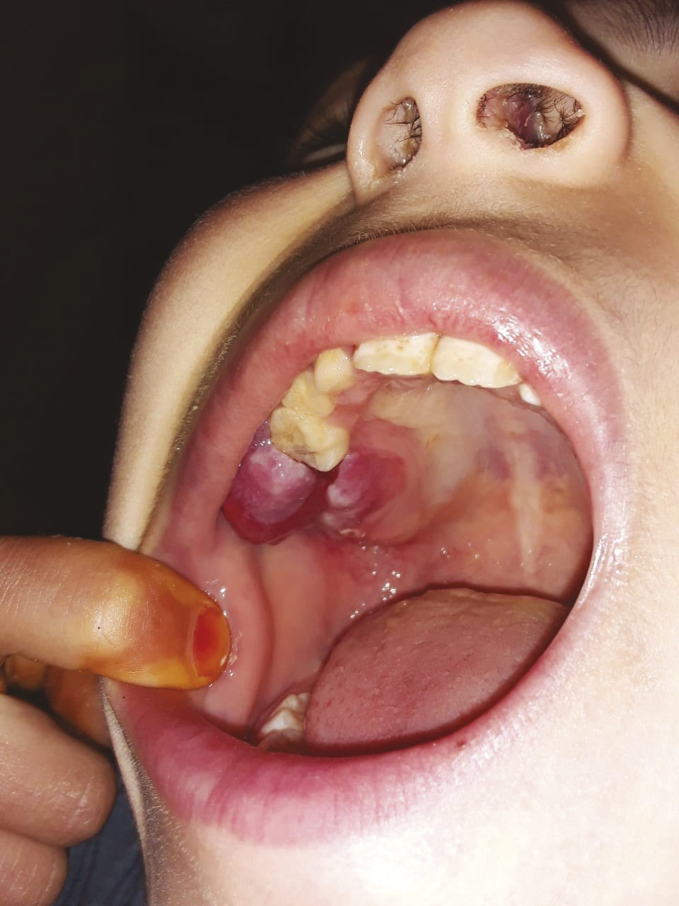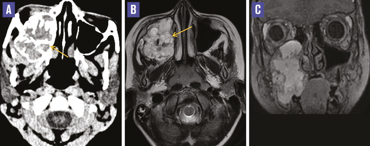 Cet enfant de 7 ans consultait pour une tuméfaction gingivale droite évoluant depuis 2 mois sans altération de l’état général. L’examen clinique notait une masse gingivale droite occupant la région maxillaire, dure, fixée avec saignement en regard (fig. 1 ). L’imagerie par résonance magnétique montrait une masse polycyclique, multiloculée, hypervasculaire, centrée sur le sinus maxillaire droit, en hyposignal T1, signal hétérogène T2, sans restriction de la diffusion, avec rehaussement intense, renfermant des zones vides de signal (fig. 2 ). La tomodensitométrie montrait cette même masse richement vascularisée, avec une composante calcifiée (fig. 2 ). L’examen histologique de la biopsie était en faveur d’un botryomycome. L’imagerie de contrôle avant le geste d’excision chirurgicale montrait une majoration en taille de la masse, renfermant des zones hématiques, responsable d’une exophtalmie homolatérale (fig. 3 ).