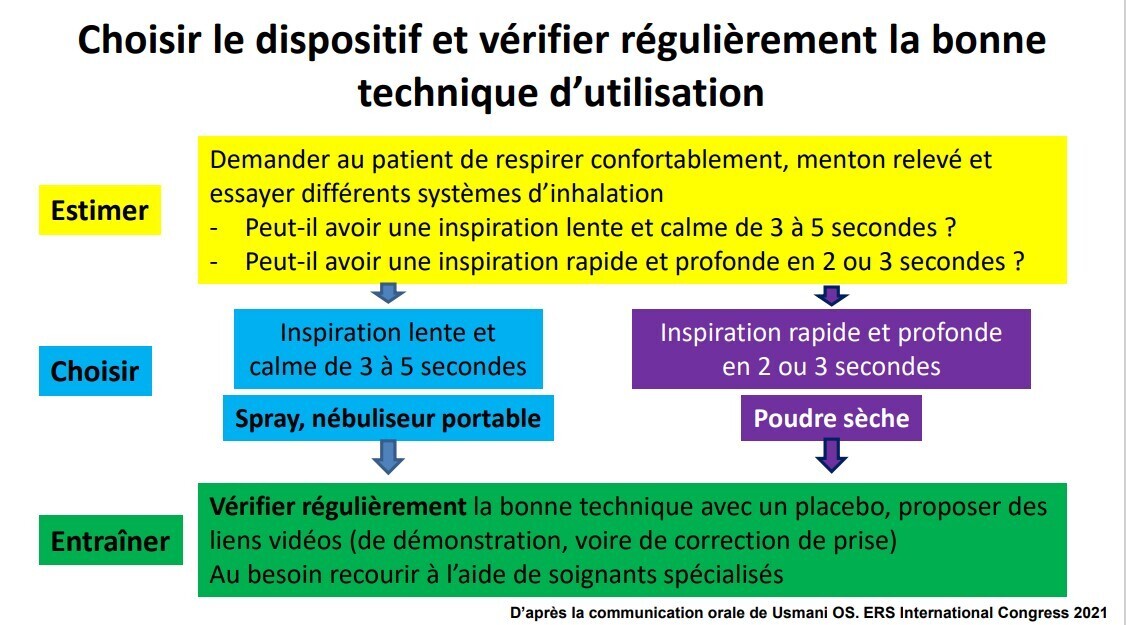 Le choix de l’inhalateur dépend surtout des capacités et de la préférence du patient (fig. 2). Il est essentiel de lui fournir les instructions et de démontrer comment réaliser correctement une inhalation, ainsi que de contrôler à chaque visite que le patient conserve une bonne technique de prise (oubli +++). On peut s’appuyer sur des vidéos sur internet (des systèmes d’IA pour suivre la bonne utilisation sont en développement). Les erreurs techniques sont très fréquentes : expiration incomplète après inhalation, pas d’apnée avant expiration post-inhalation…