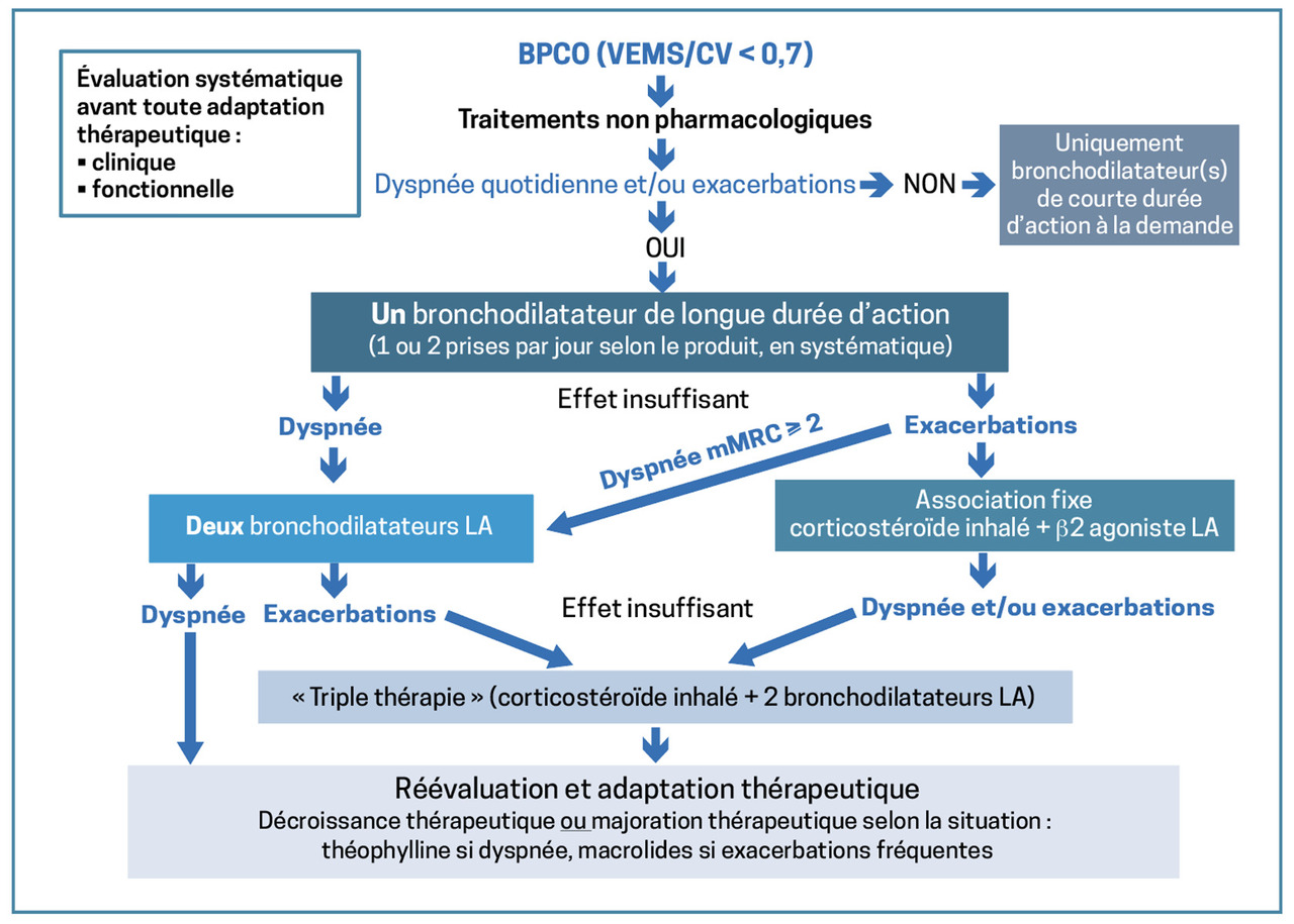 Concernant les traitements médicamenteux (fig. 1), le premier palier doit contenir des bronchodilatateurs de courte durée d’action. En cas de dyspnée quotidienne et/ou de profil dit « exacerbateur » – patient ayant fait au moins 2 exacerbations dans l’année ou un épisode requérant une hospitalisation –, on propose un bronchodilatateur de longue durée d’action : antimuscarinique (LAMA) ou β2 -agoniste (LABA). Si dyspnée d’exacerbation fréquente : une bithérapie est indiquée : LABA + LAMA ou LABA + corticostéroïdes inhalés (CSI).