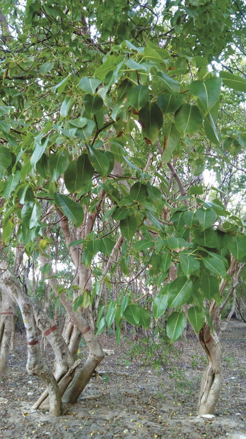 Cette femme de 59 ans, sans antécédent notable en dehors d’une surdité congénitale, était conduite aux urgences par le SAMU pour des troubles digestifs (vomissements, diarrhées, douleurs abdominales et brûlures pharyngées) ayant un retentissement hémodynamique, apparus 30 minutes après l’ingestion de 4 fruits de mancenillier. L’apparition d’une bradycardie sinusale inférieure à 40 bpm nécessitait l’injection d’atropine. Plusieurs épisodes d’hypotension artérielle justifiaient des remplissages vasculaires itératifs, les troubles hémodynamiques persistant pendant les 2 jours d’hospitalisation. La fibroscopie œsogastroduodénale ne révélait pas d’atteinte digestive majeure (énanthème pharyngé).