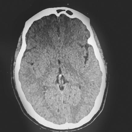 Cette femme de 38 ans consultait pour des céphalées en casque évoluant depuis une semaine. La patiente précisait avoir une rhinorrhée antérieure depuis une intervention neurochirurgicale sur adénome hypophysaire réalisée un mois auparavant. L’examen ne notait ni atteinte des paires crâniennes ni céphalée orthostatique. La patiente était apyrétique et son bilan biologique ne montrait pas de syndrome inflammatoire ou infectieux. Une liquorrhée cérébrospinale était visualisée au contact du sphénoïde à la rhinoscopie. La tomodensitométrie cérébrale était normale (fig. 1 ). La patiente était hospitalisée et, le soir même, chutait dans la salle de bains. Une nouvelle tomodensitométrie (48 h après la première) montrait une pneumencéphalie diffuse témoignant d’une brèche méningée (fig. 2 ). La chute a probablement accentué la brèche, occasionnant la pneumencéphalie secondaire.