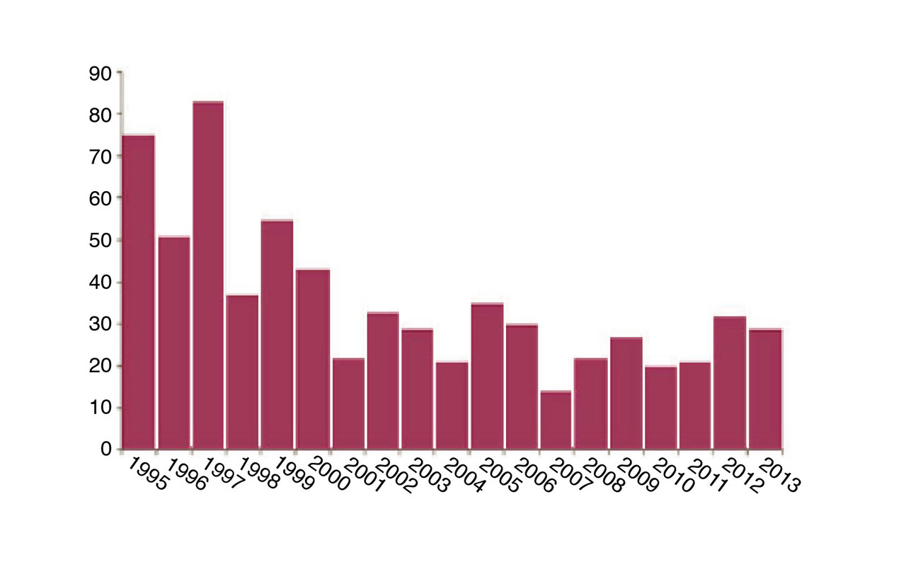 Selon une enquête menée par Santé publique France sur une période de 10 ans (début 2004-fin 2013), 250 cas de brucellose ont été recensés, soit environ 25 par an (figure). L’incidence annuelle a été de 0,3 cas par million d’habitants, avec 2 pics, en mai-juin et septembre-octobre. Parmi ces patients, 63 % étaient des hommes, âgés en moyenne de 52 ans (de 1 à 84 ans). Les cas étaient surtout sporadiques, mais 45 étaient inclus dans des petits foyers de 2 à 6 personnes. Les régions île-de-France, Rhône-Alpes et Provence-Alpes-Côte d’Azur étaient les plus touchées.