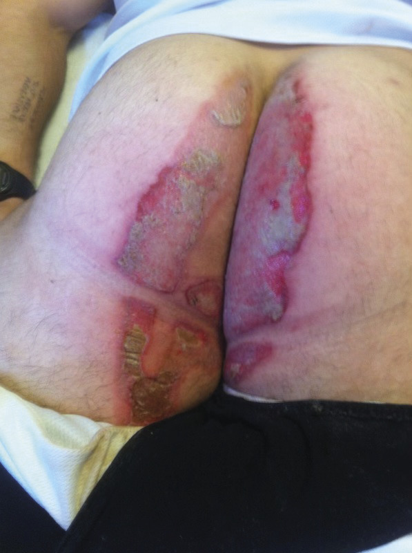 Un patient de 25 ans consulte après avoir participé à un « jeu » d’alcool : du papier toilette est inséré entre les fesses en guise de mèche. Elle est allumée, et il faut boire une bière le plus rapidement possible puis éteindre le feu avant de se brûler. Malheureusement, l’état d’ébriété avancé du jeune homme ne lui a pas permis suffisamment de réactivité. Il souffre de brûlures périnéales au deuxième degré superficiel et au deuxième degré profond (figure ).