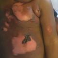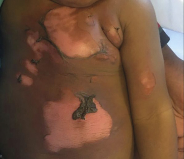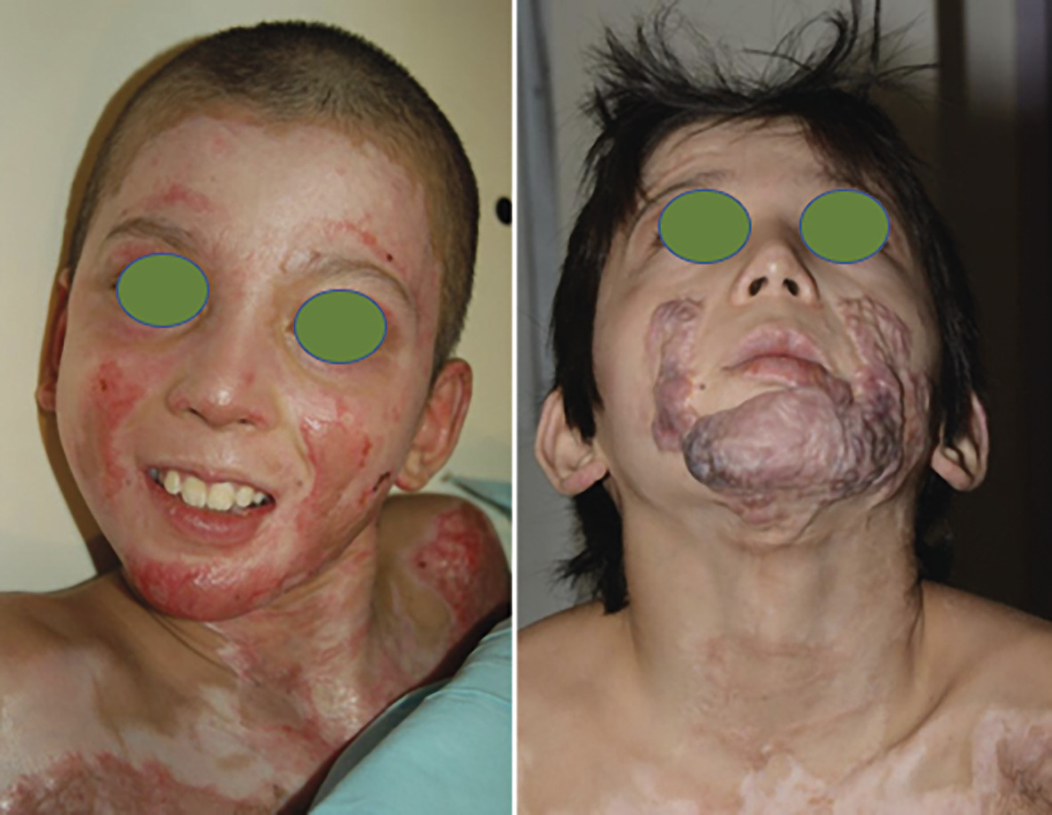 Le risque de cicatrices hypertrophiques, voire chéloïdes (fig. 5 ), est majoré lorsque les plaies sont profondes, ou sur des zones fonctionnelles, ou si le patient a une peau très claire ou très foncée, Des massages sont alors utiles une fois la phase inflammatoire initiale passée, accompagnés éventuellement de séances de kinésithérapie ou du port de vêtements ou de dispositifs compressifs (gilets, masques sur mesure...), voire d’injections locales de corticoïdes (cortisone retard injectable, Kenacort, tous les 2-3 mois).