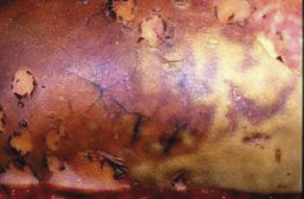 Enfin, celles du troisième degré (fig. 4 ), – escarres nécrotiques marron ou blanchâtres – requièrent une prise en charge chirurgicale d’emblée.