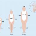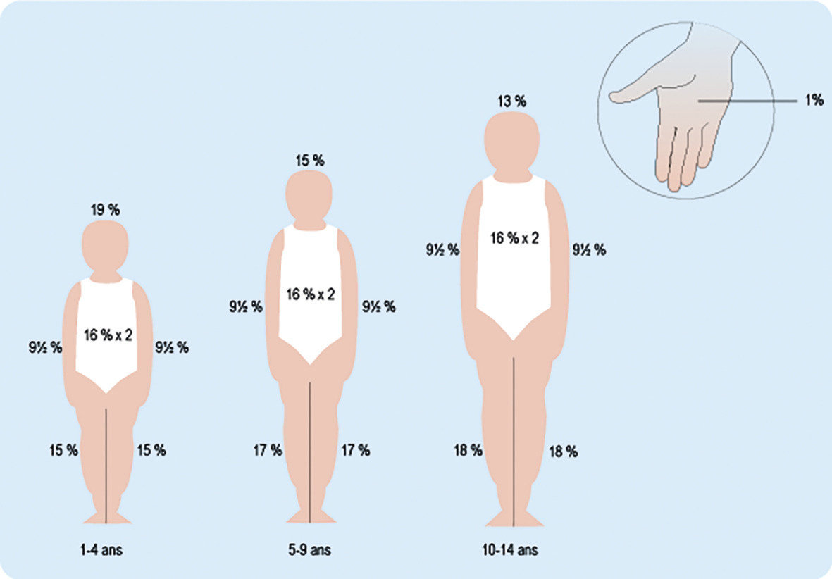 Les enfants de moins de 1 an, ou ayant des brûlures de la face, des extrémités ou du périnée, ou une surface lésée supérieure à 5 % de l’aire corporelle totale doivent être orientés en urgence vers une structure hospitalière (si > 10 % : soins intensifs pour compenser les pertes hydro-électrolytiques). De même, si les conditions de vie ne sont pas adaptées aux soins (domicile insalubre, trop exigu par rapport au nombre d’occupants…) ou si l’entourage ne semble pas fiable. À noter que l’évaluation de la surface brûlée est différente de celle de l’adulte. La règle des « 9 de Wallace » ne pouvant pas être utilisée, on emploie souvent la suivante : 1 % de surface corporelle totale = paume de la main (fig. 1 ).