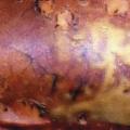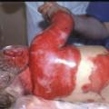Les brûlures du deuxième degré profond sont caractérisées par des phlyctènes très fines à fond rouge vif ou parfois blanchâtre (fig. 3 ). Elles sont mises sous pansement mais imposent un avis chirurgical (pour évaluer la nécessité d’une greffe de peau) car la guérison n’est possible que si la brûlure a une surface très limitée (< 2 cm de diamètre).