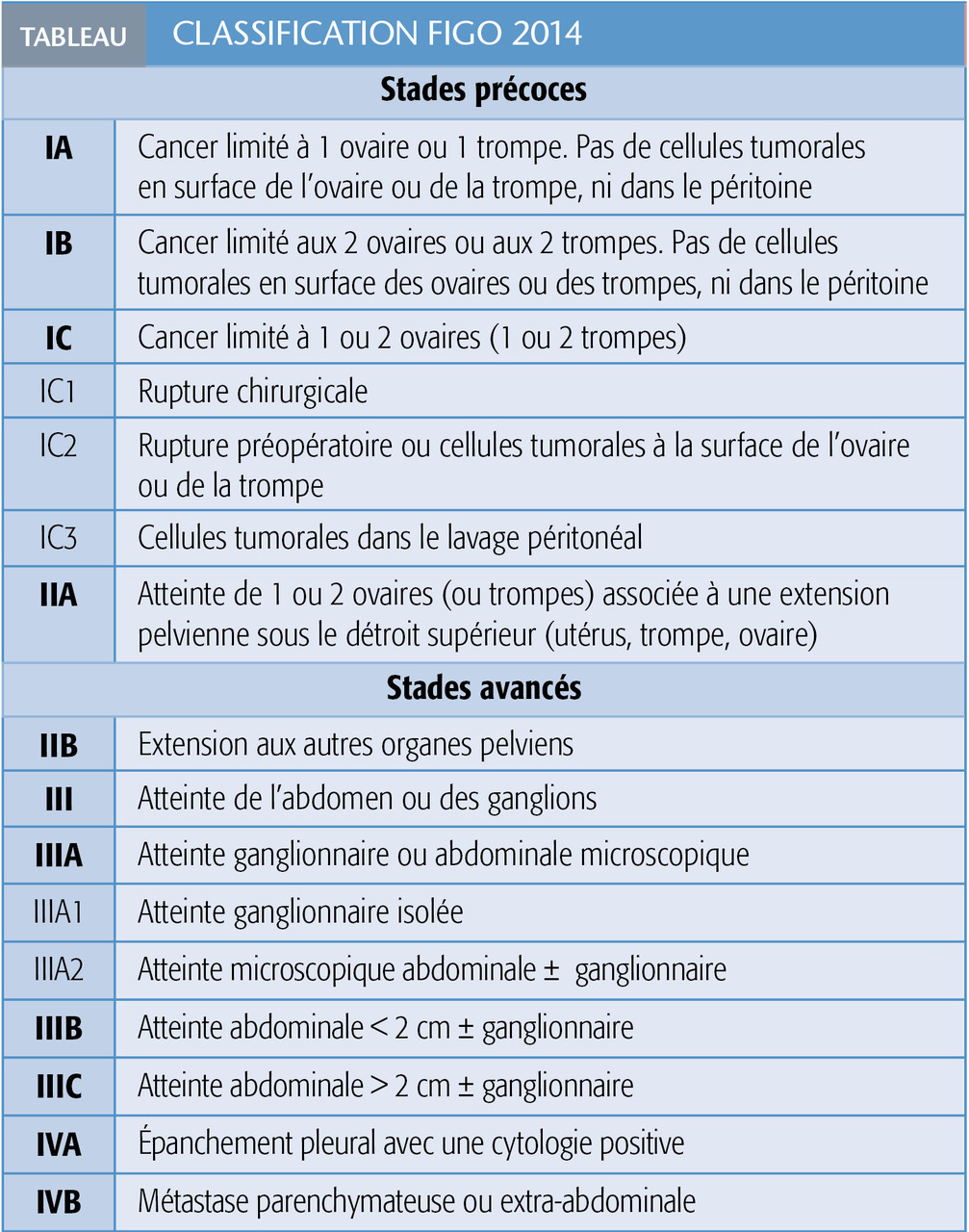 Selon la classification FIGO (tableau), on distingue les stades précoces (stades I et IIA) et les stades avancés (IIB à IV), qui représentent 75 % des cas, associés à un pronostic sombre.