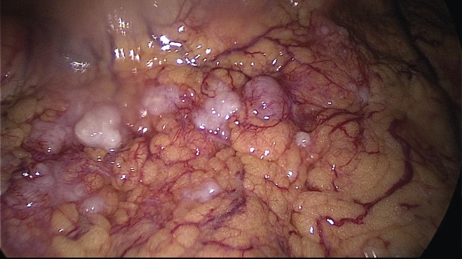 L’évaluation de la résécabilité repose sur les marqueurs tumoraux, le scanner thoraco-abdomino-pelvien ± le TEP-scan et la cœlioscopie exploratrice. L’imagerie permet d’analyser les sites difficiles ou impossibles à explorer chirurgicalement (atteinte thoracique, digestive, splénique, ganglions, métastases hépatiques parenchymateuses, pédicule hépatique…). La cœlioscopie offre une vue directe de la carcinose et de son étendue (fig. 1), sachant que des petites lésions (miliaire) peuvent être invisibles. Elle autorise cytologie et biopsies péritonéales qui confirment le diagnostic, et contribue aux scores d’étendue de carcinose (score de Sugarbaker) et de résécabilité. Critères de non-résécabilité : carcinose diffuse, rétraction du mésentère, résections digestives multiples au-delà de deux et infiltration profonde du pédicule hépatique.