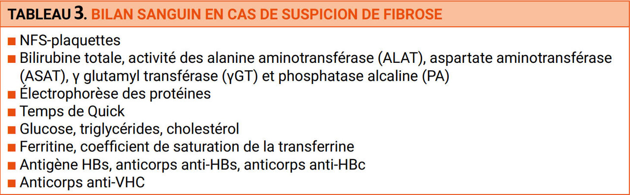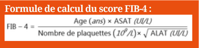 Une évaluation du risque de fibrose s’impose alors – à répéter chaque année –, suivi le cas échéant d’une échographie abdominale. Le calcul du score FIB-4 (fig. 1) permet une première appréciation de ce risque à partir de l’âge et des éléments du bilan sanguin (ASAT, ALAT et plaquettes : tableau 3) : un résultat < 1,30 écarte un risque de fibrose avancée ; un résultat > 2,67 évoque un très haut risque de fibrose avancée, mais il doit être confirmé par une mesure d’élasticité hépatique.
