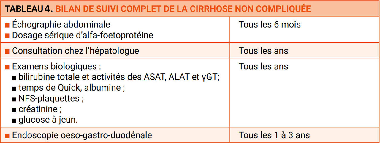 Outre la prise en charge spécifique de la (ou les) cause(s) de la cirrhose, le suivi complet d’une cirrhose non compliquée comprend plusieurs examens à réaliser tous les 6 mois ou tous les ans (tableau 4) : le généraliste coordonne ce parcours de soins et synthétise les éléments issus de la prise en charge par les différents intervenants du parcours de soins.