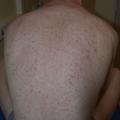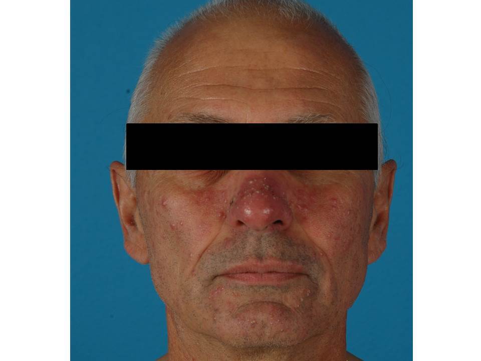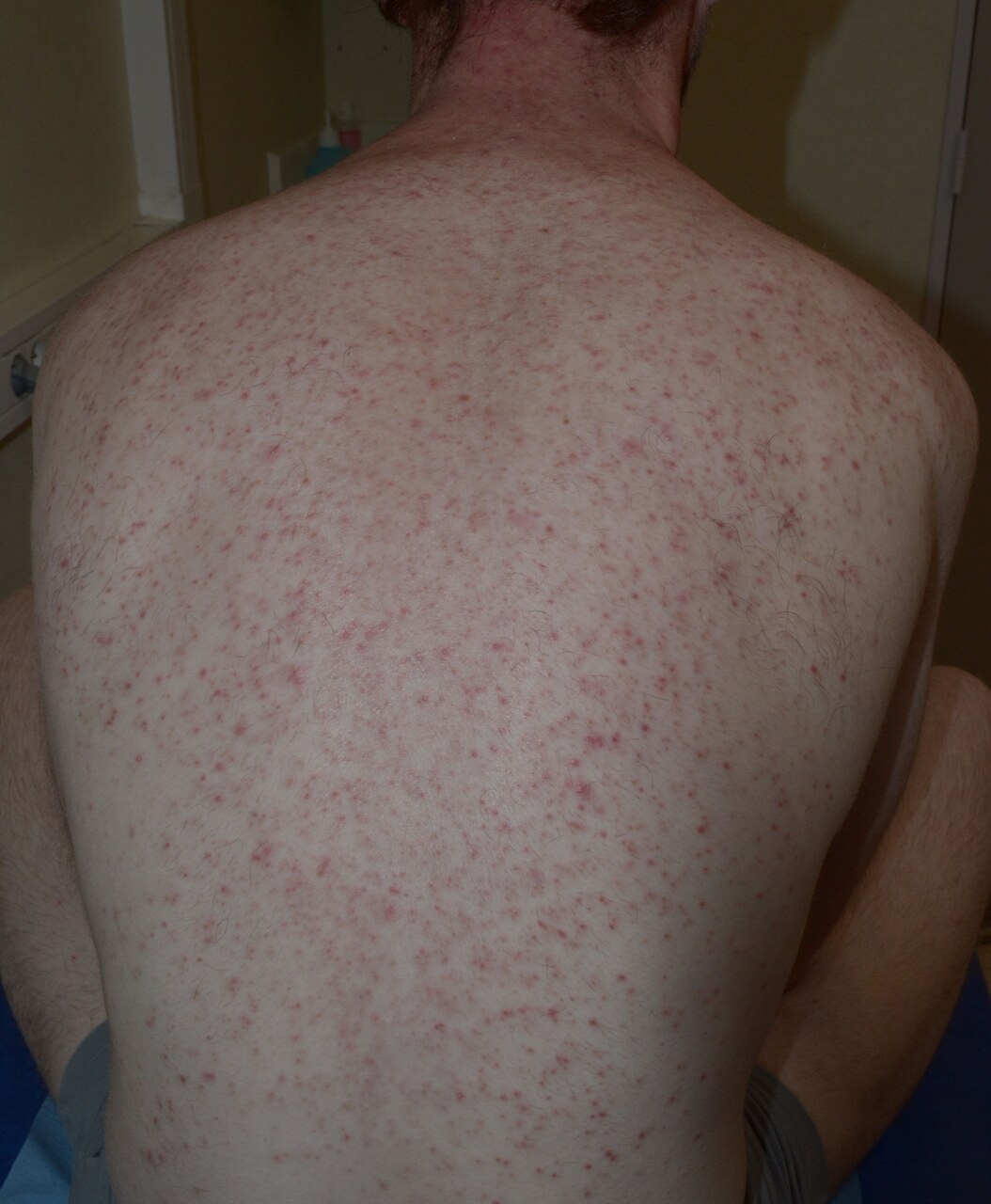 Les atteintes, souvent appelées à tort « acnéiformes », sont des papulopustules monomorphes, prédominant sur le visage et pouvant parfois s’étendre au tronc (