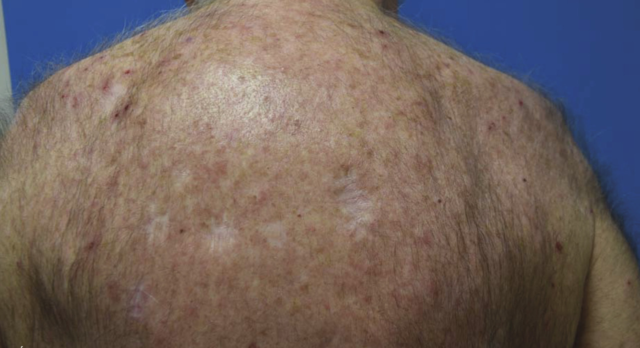 Exanthème maculopapuleux et prurit touchent plus de 15 % des patients avec les anti-PD-1. Les lésions sont volontiers eczématiformes et non spécifiques (figure), respectant le visage. Le prurit est souvent au 1er plan. Une biopsie cutanée est nécessaire en cas de forme atypique, persistante ou sévère, notamment pour éliminer une dermatose induite plus spécifique (v. infra). Traitement des rashs peu sévères : dermocorticoïdes et émollients.