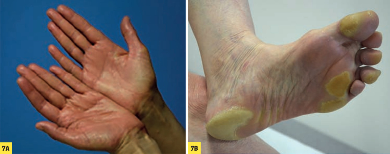 La réaction lichénoïde, 2e type d’atteinte cutanée en termes de fréquence, n’est diagnostiquée qu’après examen histologique. Les formes palmoplantaires sont possibles, tout comme l’atteinte des muqueuses génitales ou buccales.
