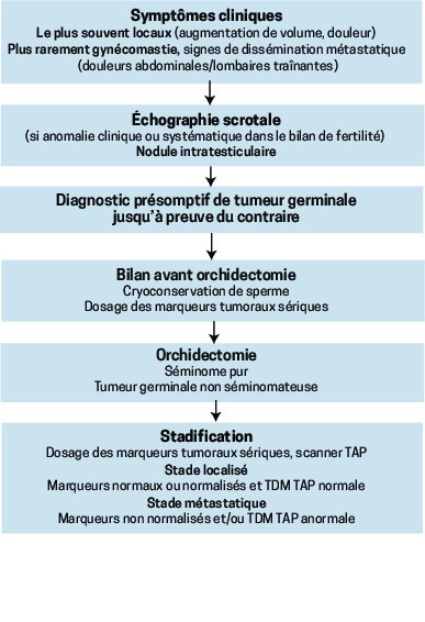 L’orchidectomie confirme le diagnostic (on enlève testicule, annexes et cordon spermatique jusqu’à l’orifice inguinal ; une prothèse peut être mise en place dans le même temps ou à distance). C’est aussi la première étape thérapeutique. Avant cet acte, ne pas oublier de :