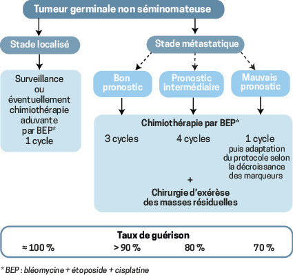 Doses et intervalles doivent être rigoureusement respectés. Le nombre de cycles est adapté au groupe pronostique de la classification internationale, selon le niveau d’élévation des marqueurs tumoraux et d’éventuelles métastases viscérales extrapulmonaires (foie, cerveau ou os). La toxicité pulmonaire potentielle de la bléomycine impose la réalisation d’épreuves fonctionnelles respiratoires avant de débuter la chimiothérapie et au-delà de la dose totale de 270 mg (3 cycles) si elle doit être poursuivie. Pour les tumeurs non séminomateuses, une chirurgie d’exérèse de toutes les masses métastatiques résiduelles supracentimétriques s’impose au décours de la chimiothérapie.