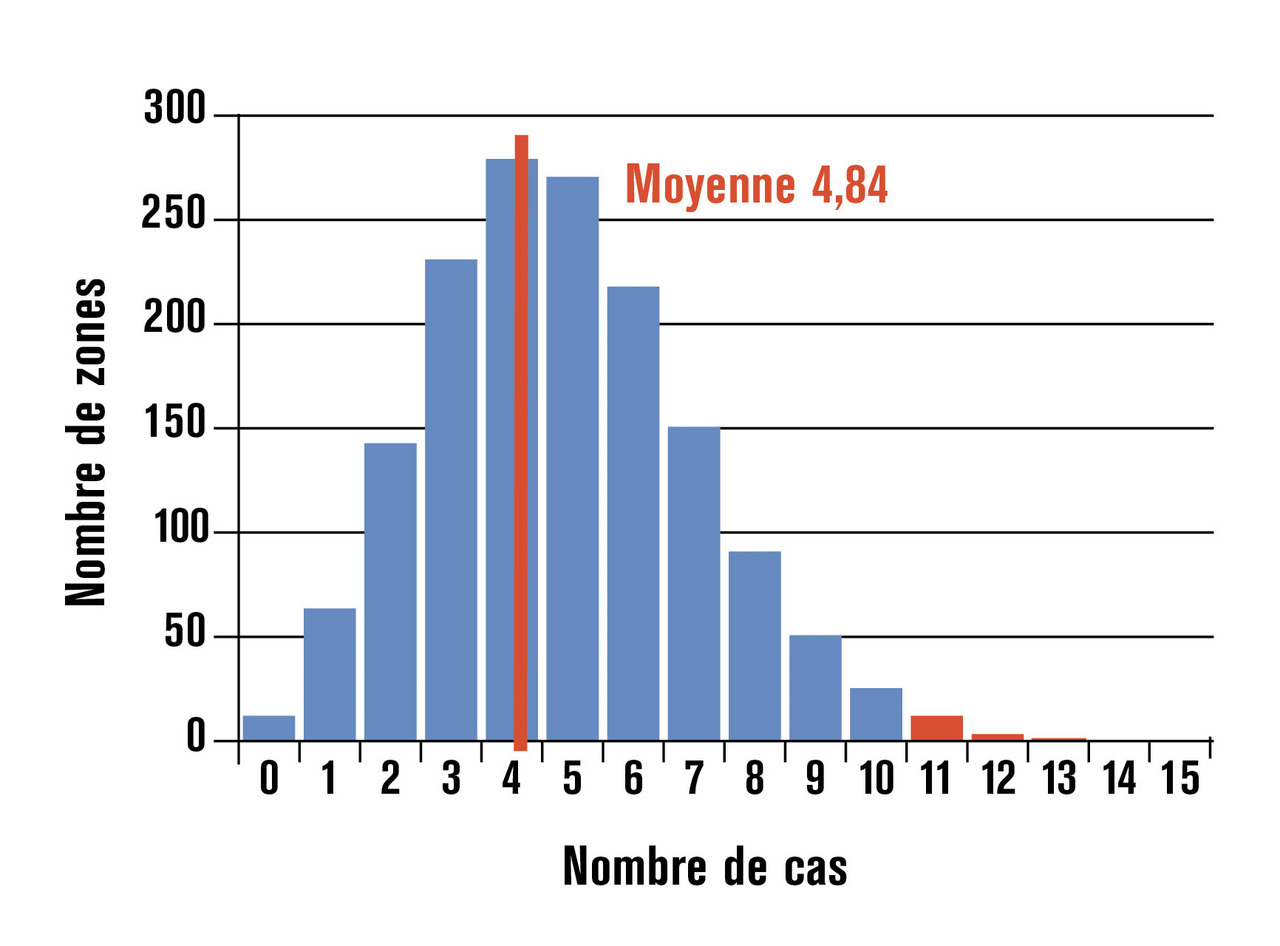 Mais on peut aussi se demander dans combien de zones contenant le même nombre d’enfants de 0 à 14 ans en France on attend au moins 11 cancers entre 0 et 14 ans en 4,25 ans. On estime qu’il y a 1 770 cancers pédiatriques par an en France,1, 2 donc on attend 1 770 × 4,25 =7 522 cancers entre 0 et 14 ans dans la France entière en 4,25 ans. On peut imaginer diviser la France en zones contenant le même nombre d’enfants entre 0 et 14 ans que les 7 communes étudiées ; dans chaque zone, on attend 4,84 cas en moyenne, il y a donc 7 522/4,84 = 1 554 de ces zones puisque le nombre total de cas attendu est de 7 522. La figure ci-contre montre la répartition des zones en fonction du nombre de cas attendu. Le nombre de zones dans lesquelles on attend 11 enfants ou plus atteints de cancer, calculé en utilisant la loi de Poisson*, est égal à 17. Il existe simplement, sous l’effet du hasard, d’autres zones avec au moins 2 fois plus de cancers qu’attendus. La situation à Sainte-Pazanne n’est donc pas anormale, c’est juste un rassemblement de communes contiguës dans laquelle on observe par hasard plus de cas que la moyenne, mais il existe à coup sûr d’autres rassemblements de communes avec le même excès.