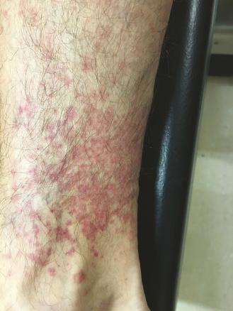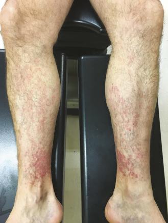 Ce marin de 42 ans consultait pour une éruption des membres inférieurs apparue au retour du Vietnam. Il rapportait avoir subi un massage de type « shiatsu » assez tonique, en particulier sur les membres inférieurs à peine deux heures avant le long vol de retour. L’examen clinique notait des lésions purpuriques des deux membres inférieurs (fig. 1 et 2 ) sans manifestations infectieuses associées ni signe méningé. Le reste de l’examen clinique était sans particularité, en dehors d’une insuffisance veineuse des membres inférieurs. La biologie ne montrait pas d’anomalie plaquettaire ni de la coagulation. Le patient était adressé à un dermatologue, qui confirmait la capillarite purpurique favorisée par le vol prolongé et le massage, le tout associé à l’insuffisance veineuse préexistante. L’évolution était spontanément favorable, avec régression complète des lésions.