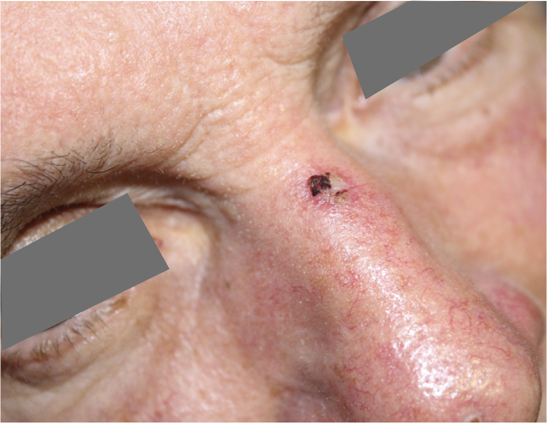 À l’examen de Michel, 68 ans, nous remarquons une lésion croûteuse au niveau de l’arête nasale. Le patient nous explique qu’elle perdure depuis 2 mois, et qu’elle est due au port de ses lunettes.