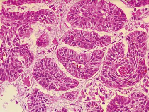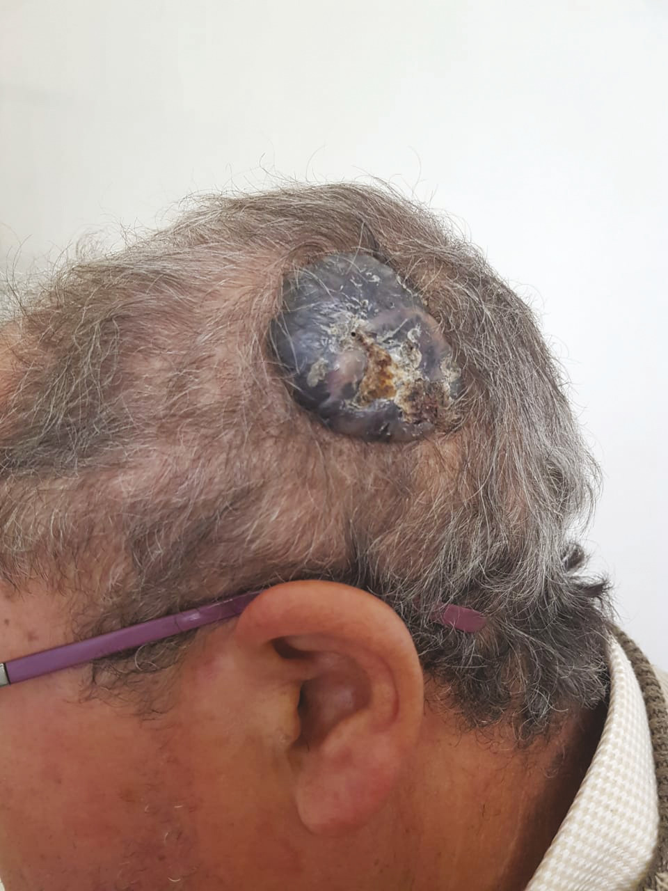 Cet homme de 54 ans, agriculteur, avait depuis 5 ans une lésion nodulaire du scalp à croissance lente évoluant vers l’ulcération. À l’examen dermatologique, on notait une lésion unique bien limitée, hyperpigmentée, sur la région pariétale gauche, mesurant 5 x 6 cm. Cette lésion était ferme, sans saignement au contact (fig. 1 ). Il n’y avait pas d’adénopathies cervicales. À l’histologie, le derme était le siège d’une prolifération carcinomateuse infiltrante agencée en massifs et amas tatoués de mélanine. Les noyaux présentaient des atypies avec agencement palissadique en périphérie (fig. 2 ). Il s’agissait d’un carcinome basocellulaire nodulaire tatoué. Une exérèse chrirugicale était réalisée, avec des marges saines de 5 mm et une bonne évolution.