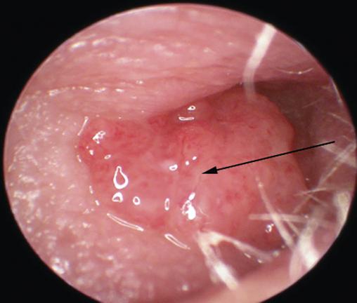Jean-Pierre, 74 ans, a eu une otorrhée unilatérale (devenue chronique) purulente il y a 5 mois. S’y sont associées progressivement une otalgie intense et une paralysie faciale homolatérales. Pas d’adénopathies. À l’examen, une masse rouge, spontanément douloureuse, est retrouvée dans le CAE. Une biopsie est réalisée.