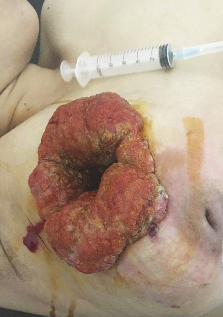 Cette femme de 39 ans, sans antécédents pathologiques, a consulté pour une tuméfaction mammaire droite évoluant depuis un an. Il existait une lésion ulcéro-bourgeonnante en chou-fleur du quadrant supéro-externe, irrégulière et inflammatoire, dont le grand axe mesurait 9 cm (